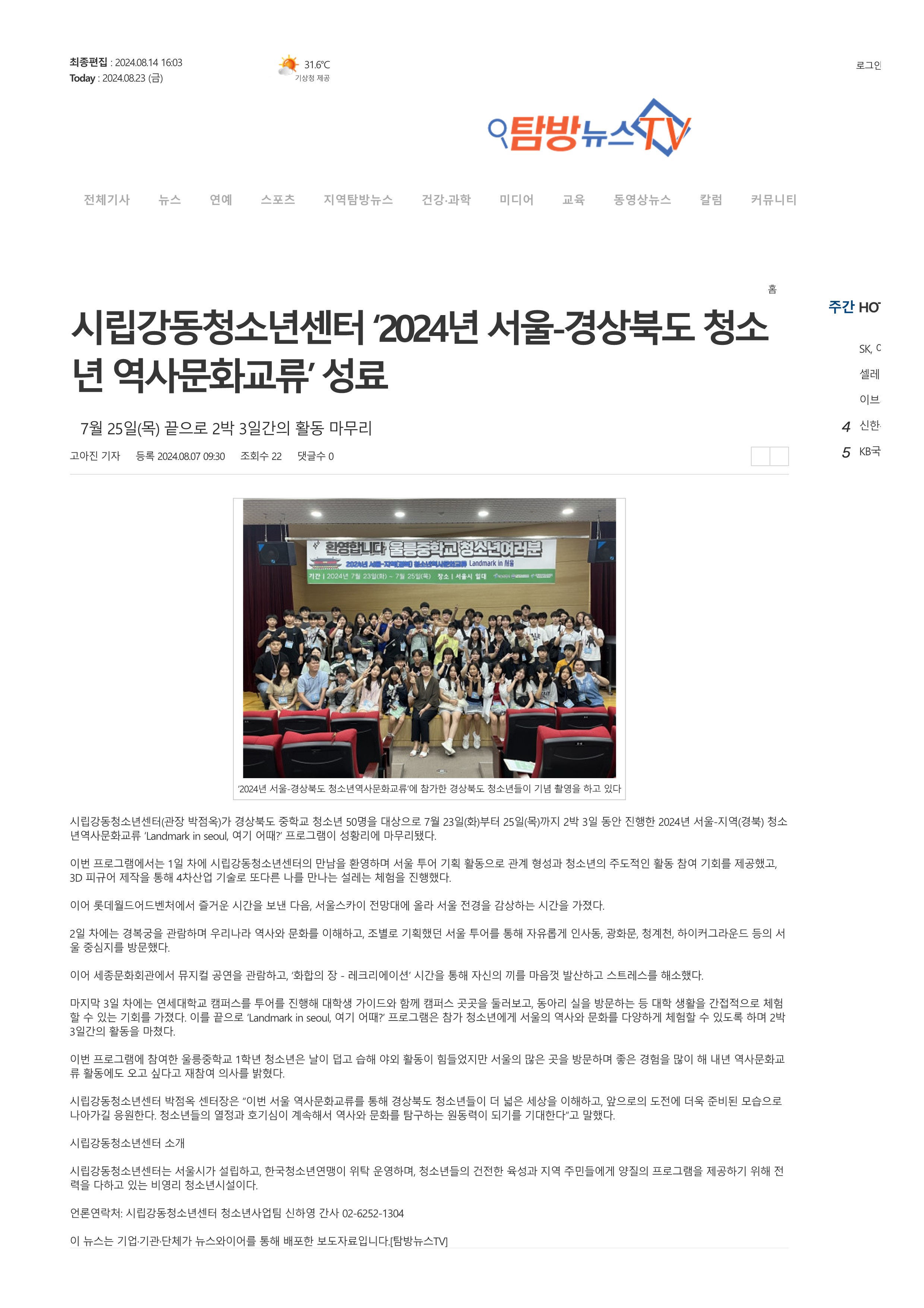 | [2024-08-07]½Ã¸³°µ¿Ã»¼Ò³â¼¾ÅÍ ¡®2024³â ¼¿ï-°æ»óºÏµµ û¼Ò³â ¿ª»ç¹®È±³·ù¡¯ ¼º·á | |||||