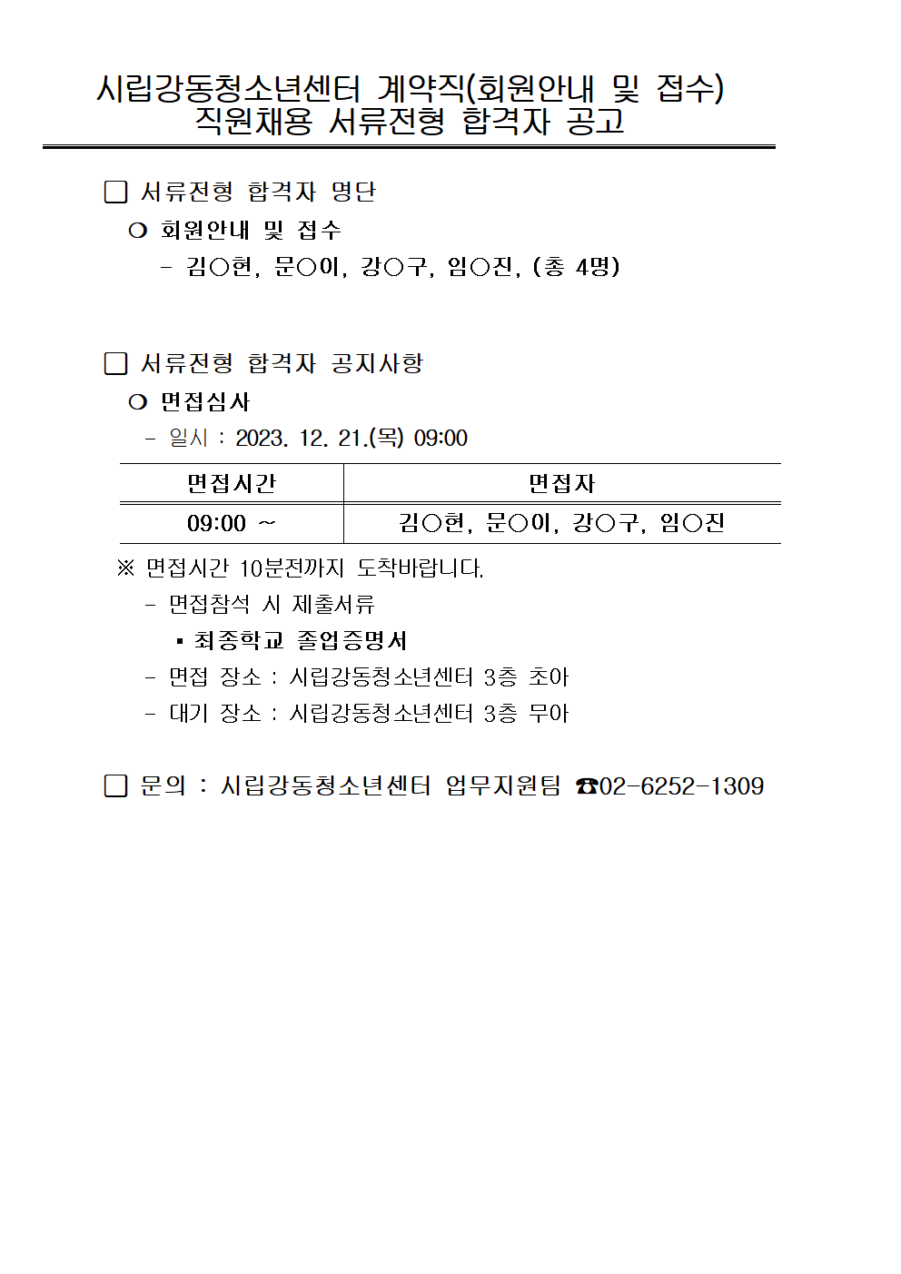 | ½Ã¸³°µ¿Ã»¼Ò³â¼¾ÅÍ °è¾àÁ÷ Á÷¿ø(ȸ¿øÁ¢¼ö ¹× ¾È³»)ä¿ë ¼·ùÀüÇü ÇÕ°ÝÀÚ °ø°í | |||