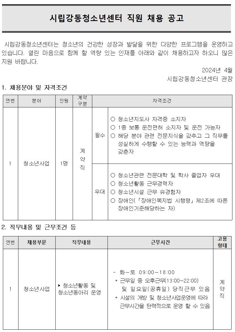 | ½Ã¸³°µ¿Ã»¼Ò³â¼¾ÅÍ Á÷¿ø(û¼Ò³â»ç¾÷) ä¿ë °ø°í | |||