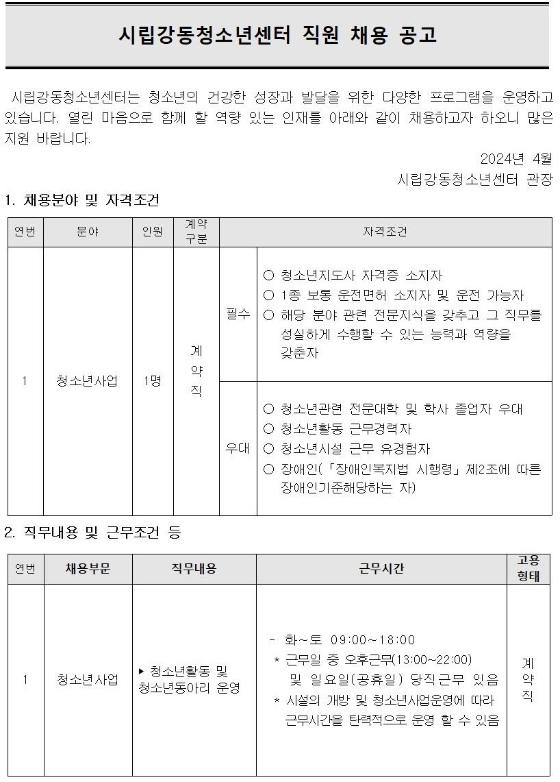 | (¼öÁ¤)½Ã¸³°µ¿Ã»¼Ò³â¼¾ÅÍ Á÷¿ø(û¼Ò³â»ç¾÷) ä¿ë °ø°í | |||