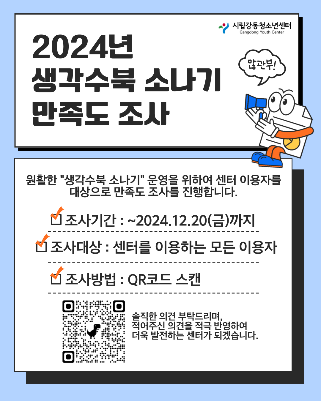 | ÀÌÀü±Û | (¸¶°¨)2024³â °µ¿Ã»¼Ò³â¼¾ÅÍ ÇϹݱâ ÀÌ¿ëÀÚ ¸¸Á·µµ Á¶»ç |