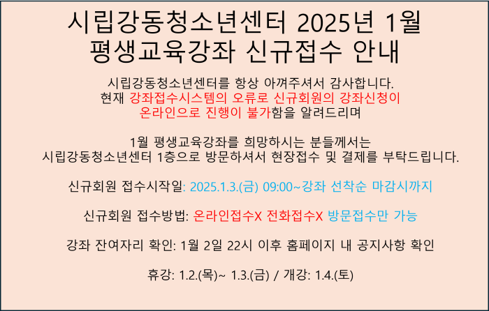 | °µ¿Ã»¼Ò³â¼¾ÅÍ 2025³â 1¿ù ½Å±Ôȸ¿ø Á¢¼ö º¯°æ»çÇ× ¾È³» | |||