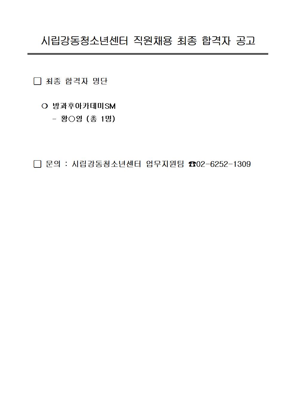 | ½Ã¸³°µ¿Ã»¼Ò³â¼¾ÅÍ Á÷¿ø ä¿ë ÃÖÁ¾ÇÕ°ÝÀÚ °ø°í | |||
