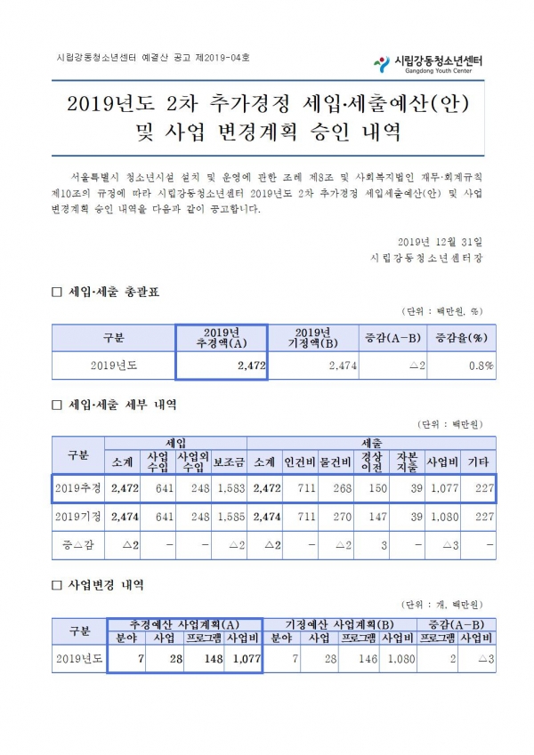 | [¿¹»ê°ø°í] 2019³â 2Â÷ Ãß°æ ¼¼ÀÔ¼¼Ã⿹»ê ¹× »ç¾÷ º¯°æ°èȹ ½ÂÀÎ ³»¿ª °ø°í | |||