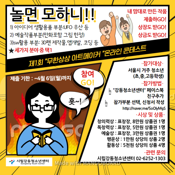 <½Åû¹æ¹ý> 1) ½Ã¸³°µ¿Ã»¼Ò³â¼¾ÅÍ ÆäÀ̽ººÏ(www.facebook.com/wagle.kd) Ä£±¸Ãß°¡ Çϱâ 2) ½Åû¼ ³×À̹ö Æû(http://naver.me/5oOlyMgS) ¾ç½ÄÀ¸·Î Á¦Ãâ!! 3) ²ô~~~ÀÄ!!! <½Ã»ó°ü·Ã> -âÀǷ»ó : ¼¾ÅÍ Ç¥Ã¢Àå ¹× 8¸¸¿ø »ó´çÀÇ ½Ã»óǰ 1¸í -µ¶Ã¢·Â»ó : ¼¾ÅÍ Ç¥Ã¢Àå ¹× 5¸¸¿ø »ó´çÀÇ ½Ã»óǰ 1¸í -¿¹¼ú»ó : ¼¾ÅÍ Ç¥Ã¢Àå ¹× 3¸¸¿ø »ó´çÀÇ ½Ã»óǰ 1¸í * Çà¿î»ó : 1¸¸¿ø »ó´çÀÇ ½Ã»óǰ 2¸í, Ȱµ¿»ó : 5õ¿ø »ó´çÀÇ ½Ã»óǰ 4¸í * (Çà¿î»ó°ú Ȱµ¿»óÀÇ °æ¿ì´Â SNS È«º¸ ¿ì¼öÀÚ¿¡°Ô ½Ã»óÇÕ´Ï´Ù!!) 4¿ù 10ÀÏ ¼±ÀåÀÛÀ» ¹ßÇ¥ÇÕ´Ï´Ù!!