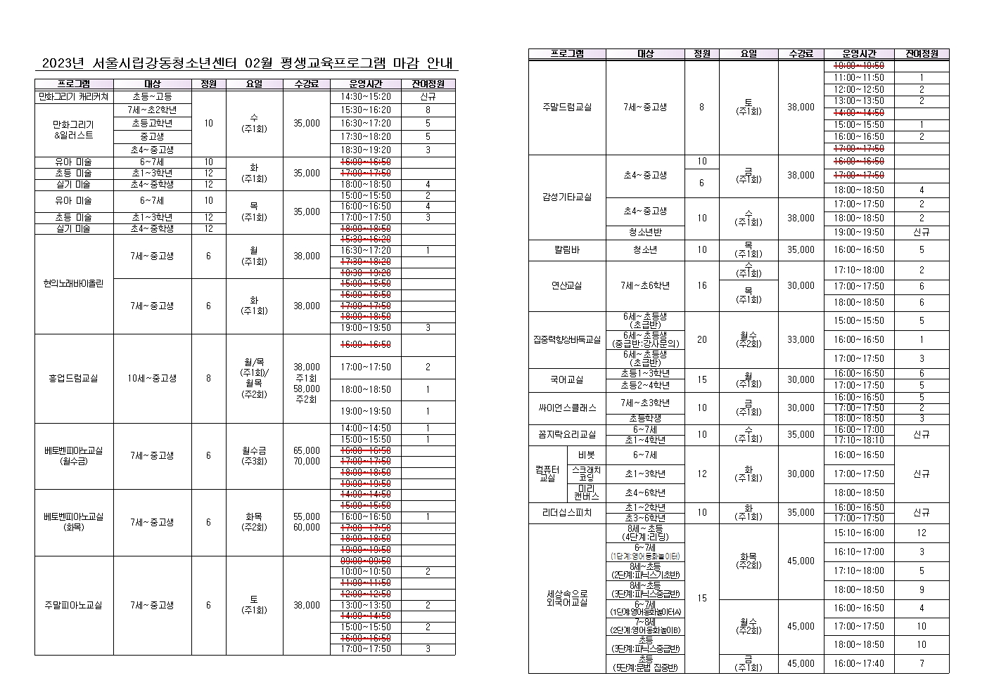 01¿ù 20ÀÏ 18½Ã ±âÁØÀ¸·Î ±âÁ¸È¸¿ø Á¢¼ö¸¦ ¸¶°¨ÇÏ¿´½À´Ï´Ù. ¡Ú 2023³â 02¿ù Æò»ý±³À°ÇÁ·Î±×·¥ ½Å±Ôȸ¿ø °ÁÂÁ¢¼ö´Â 01¿ù 25ÀÏ(¼ö)¿ÀÀü 9½Ã¿¡ ½ÃÀÛÇÕ´Ï´Ù. ¡Ú ÇÁ·Î±×·¥ ȸ¿ø Á¢¼ö´Â ¼±Âø¼øÀ¸·Î ÁøÇàµÇ¸ç ¼ø¹ø¿¡ µû¶ó Á¢¼ö¸¦ ½ÃÀÛÇÕ´Ï´Ù. À§°Á º° ÀÜ¿©ÀοøÀ» È®ÀÎÇϽðí, 1/25(¼ö) ¼¾ÅÍ Á÷Á¢ ¹æ¹®ÇÏ¿© Á¢¼öÇÏ¿© Áֽñ⠹ٶø´Ï´Ù. ½Å±Ôȸ¿ø Á¢¼öÀÏ¿¡´Â ÇöÀå Á¢¼ö¸¦ ¿ì¼±À¸·Î Çϰí, À¯¼±Á¢¼ö´Â ¿ÀÈÄ 1½ÃºÎÅÍ ÁøÇàµÇ¿À´Ï ÀÌ Á¡ À¯ÀÇÇÏ¿©Áֽñ⠹ٶø´Ï´Ù. ¼¾ÅͰ¡ óÀ½À̽нűÔȸ¿øÀº ¼ø¼ ±â´Ù¸®½Ã´Â µ¿¾È ½Å±Ôȸ¿ø ½Åû¼¸¦ ÀÛ¼ºÇϽðí, ¹øÈ£Ç¥¿Í ÇÔ²² ¾È³»µ¥½ºÅ©¿¡ Á¦½ÃÇÏ¿© Áֽñ⠹ٶø´Ï´Ù.