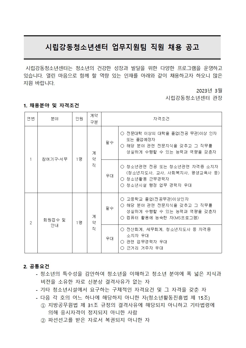 | ½Ã¸³°µ¿Ã»¼Ò³â¼¾ÅÍ ¾÷¹«Áö¿øÆÀ °è¾àÁ÷ Á÷¿ø ä¿ë °ø°í | |||