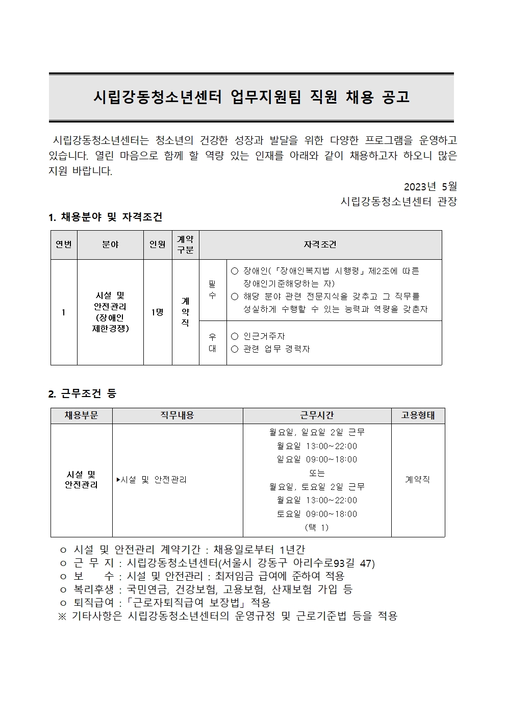 | ½Ã¸³°µ¿Ã»¼Ò³â¼¾ÅÍ ¾÷¹«Áö¿øÆÀ Á÷¿ø ä¿ë °ø°í (1¸í Àå¾ÖÀÎÁ¦ÇѰæÀï) | |||