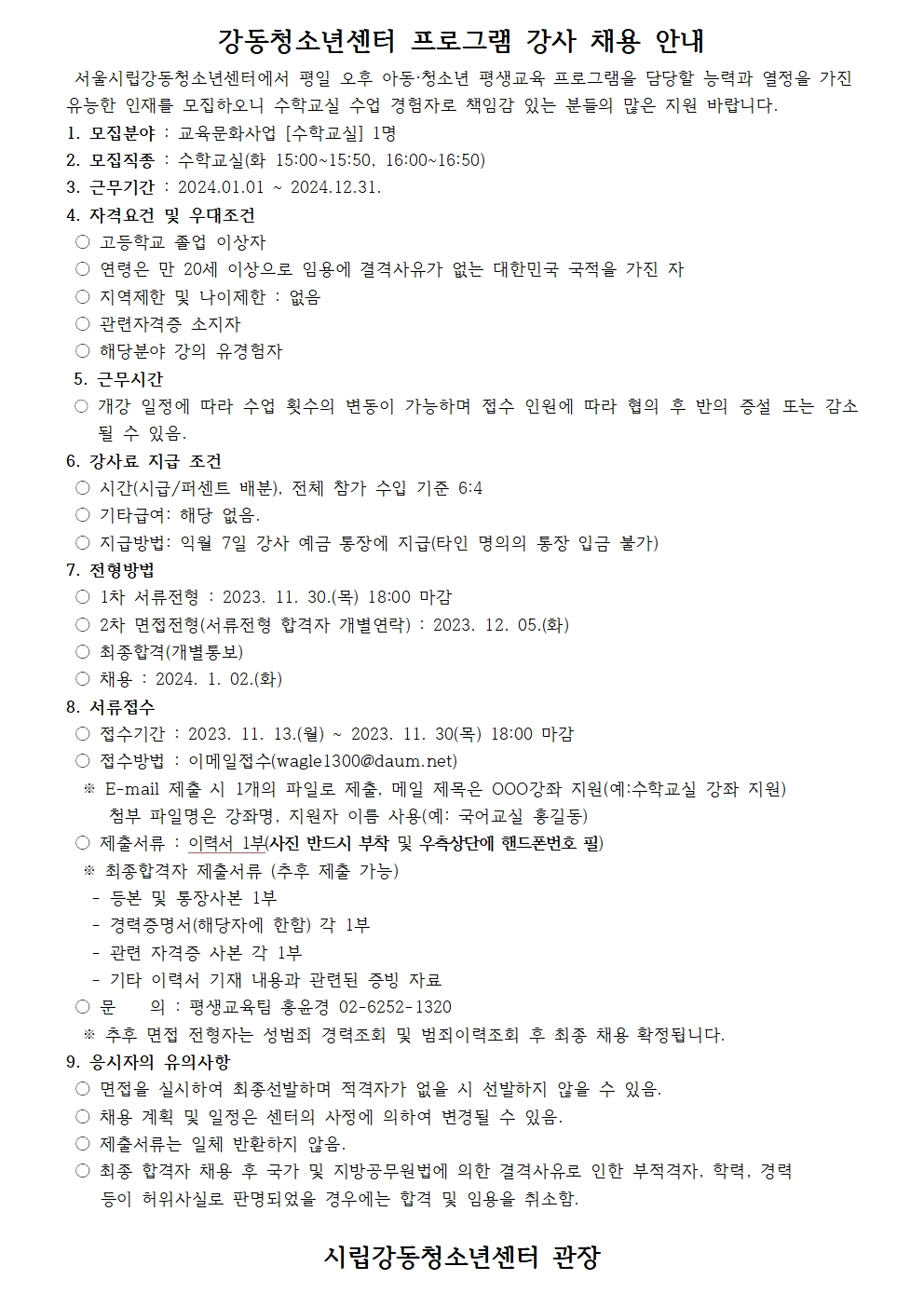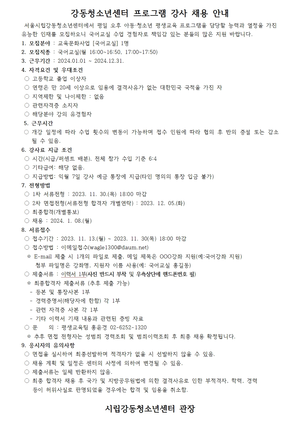 | ÀÛ¼ºÀÚ : ½Ã¸³°µ¿Ã»¼Ò³â¼¾ÅÍ(wagle1300@daum.net) ÀÛ¼ºÀÏ : 2023-11-13 Á¶È¸¼ö : 1354 | |||