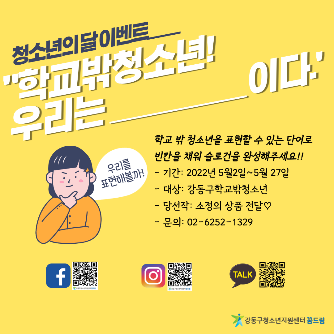 °­µ¿±¸ ²Þµå¸² Ä£±¸µéÀÌ »ý°¢ÇÏ´Â Çб³ ¹Û û¼Ò³âÀ̶õ ¹«¾ùÀΰ¡¿ä? ¸ÚÁø ½½·Î°ÇÀ» ¶°¿Ã·Á Á¦¾ÈÇØÁÖ¼¼¿ä! Âü¿© û¼Ò³âÀº Ãß÷À» ÅëÇØ ¼ÒÁ¤ÀÇ »óǰÀ» Á¦°øÇÕ´Ï´Ù!