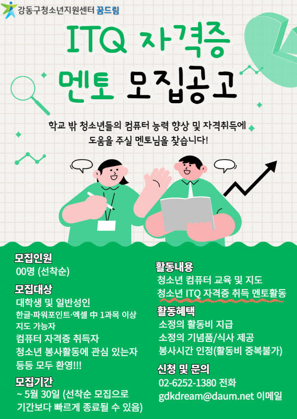 1. Ȱµ¿ °³¿ä ¡Û »ç ¾÷ ¸í : ²Þµå¸² ¸àÅä´Ü ¡Û ¸ðÁý±â°ü : °µ¿±¸ û¼Ò³âÁö¿ø¼¾ÅÍ ²Þµå¸² ¡Û Ȱµ¿ÀÏÁ¤ : 6¿ù ~ 8¿ù, ÁÖ 2ȸ ÆòÀÏ ¿ÀÀü (¿¹Á¤) ¡Û Ȱµ¿³»¿ë : Çб³ ¹Û û¼Ò³â ´ë»ó ÄÄÇ»ÅÍ ±³À° ¹× Áöµµ, ITQ ÀÚ°ÝÁõ Ãëµæ ¸àÅäȰµ¿ ¡Û Ȱµ¿Àå¼Ò : °µ¿±¸ û¼Ò³âÁö¿ø¼¾ÅÍ ²Þµå¸² ¡Ø ²Þµå¸² ¸àÅä¶õ? Çб³ ¹Û û¼Ò³âÀÇ Çо÷º¹±Í¿Í »çȸÁøÀÔ µîÀ» µ½±â À§ÇØ ¼³Ä¡µÈ û¼Ò³âÁö¿ø¼¾ÅÍ ²Þµå¸²¿¡¼ û¼Ò³âµé¿¡°Ô ÇнÀÁö¿ø(°ËÁ¤°í½Ã°øºÎÁöµµ), Á¤¼Áö¿ø(°í¹Î»ó´ã) Ȱµ¿À» ÇÏ´Â Àç´É±âºÎÀÚµéÀ» ÀǹÌÇÕ´Ï´Ù. 2. ¸àÅä´Ü ¸ðÁý°³¿ä ¡Û ¸ðÁý´ë»ó : ´ëÇÐ(¿ø)»ý, ÈÞÇлý, Á¹¾÷»ý, ÀϹݼºÀÎ [ÄÄÇ»ÅÍ ±³À° ¹× Áöµµ°¡ °¡´ÉÇÑ ÀÚ] ¡Û ¸ðÁýÀοø : 0¸í ¡Û ¸ðÁý±â°£ : ¿¬Áß »ó½Ã ¡Û ½Åû¹æ¹ý : ¸àÅäÁö¿ø½Åû¼ ÀÛ¼º ¸ÞÀÏÁ¢¼ö ¹× Àüȹ®ÀÇ(gdkdream@daum.net) ¡Û ¹® ÀÇ : ¸àÅ丵 ´ã´çÀÚ (02-6252-1380, 1391,1329) 3. ¼±¹ß ¹× Ȱµ¿ÀýÂ÷ ¼·ù Á¢¼ö | ¢Ñ | ¿À¸®¿£Å×ÀÌ¼Ç | ¢Ñ | ¸àÅäȰµ¿ | ¼·ù Á¢¼ö ¹× ¼±¹ß | ¸àÅäȰµ¿¾È³» ¹× ±³À° | ¸àƼ ¸ÅĪ ÈÄ È°µ¿ ½ÃÀÛ |