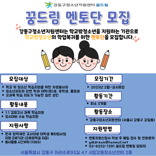 1. Ȱµ¿ °³¿ä ¡Û »ç ¾÷ ¸í : ²Þµå¸² ¸àÅä´Ü ¡Ø Çѱ¹ÀåÇÐÀç´Ü ±³¡¤»ç´ë»ý µî ´ëÇлý Æ©Å͸µ »ç¾÷ ±Ù·Î±â°ü ¡Û ¸ðÁý±â°ü : °µ¿±¸ û¼Ò³âÁö¿ø¼¾ÅÍ ²Þµå¸² ¡Û Ȱµ¿±â°£ : 2023³â 2¿ù ~ 12¿ù (´Ü±â, Àå±â Á¶Á¤ °¡´É) (ÃÖ¼Ò 3°³¿ù) ¡Û Ȱµ¿³»¿ë : Çб³ ¹Û û¼Ò³â ´ë»ó ÇнÀÁö¿ø ¸àÅä Ȱµ¿ ¡Û Ȱµ¿Àå¼Ò : °µ¿±¸ û¼Ò³âÁö¿ø¼¾ÅÍ ²Þµå¸² ¡Ø ²Þµå¸² ¸àÅä¶õ? Çб³ ¹Û û¼Ò³âÀÇ Çо÷º¹±Í¿Í »çȸÁøÀÔ µîÀ» µ½±â À§ÇØ ¼³Ä¡µÈ û¼Ò³âÁö¿ø¼¾ÅÍ ²Þµå¸²¿¡¼ û¼Ò³âµé¿¡°Ô ÇнÀÁö¿ø(°ËÁ¤°í½Ã°øºÎÁöµµ), Á¤¼Áö¿ø(°í¹Î»ó´ã) Ȱµ¿À» ÇÏ´Â Àç´É±âºÎÀÚµéÀ» ÀǹÌÇÕ´Ï´Ù. 2. ¸àÅä´Ü ¸ðÁý°³¿ä ¡Û ¸ðÁý´ë»ó : ´ëÇÐ(¿ø)»ý, ÈÞÇлý, Á¹¾÷»ý, ÀϹݼºÀÎ ¡Û ¸ðÁýÀοø : 0¸í ¡Û ¸ðÁý±â°£ : ¿¬Áß »ó½Ã ¡Û ½Åû¹æ¹ý : ¸àÅäÁö¿ø½Åû¼ ÀÛ¼º ¸ÞÀÏÁ¢¼ö ¹× Àüȹ®ÀÇ(gdkdream@hanmail.net) ¡Û ¹® ÀÇ : ¸àÅ丵 ´ã´çÀÚ (02-6252-1391, 1380,1329) 3. ¼±¹ß ¹× Ȱµ¿ÀýÂ÷ ¼·ù Á¢¼ö | ¢Ñ | ¿À¸®¿£Å×ÀÌ¼Ç | ¢Ñ | ¸àÅäȰµ¿ | ¼·ù Á¢¼ö ¹× ¼±¹ß | ¸àÅäȰµ¿¾È³» ¹× ±³À° | ¸àƼ ¸ÅĪ ÈÄ È°µ¿ ½ÃÀÛ |